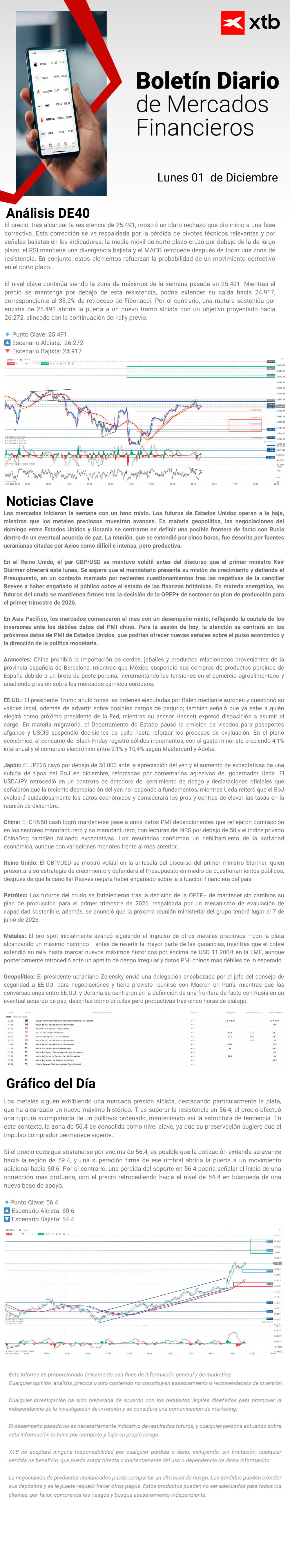 - Análisis técnico para el commodity del día: Evaluación técnica del commodity destacado, identificando tendencias, patrones y posibles escenarios de corto plazo.