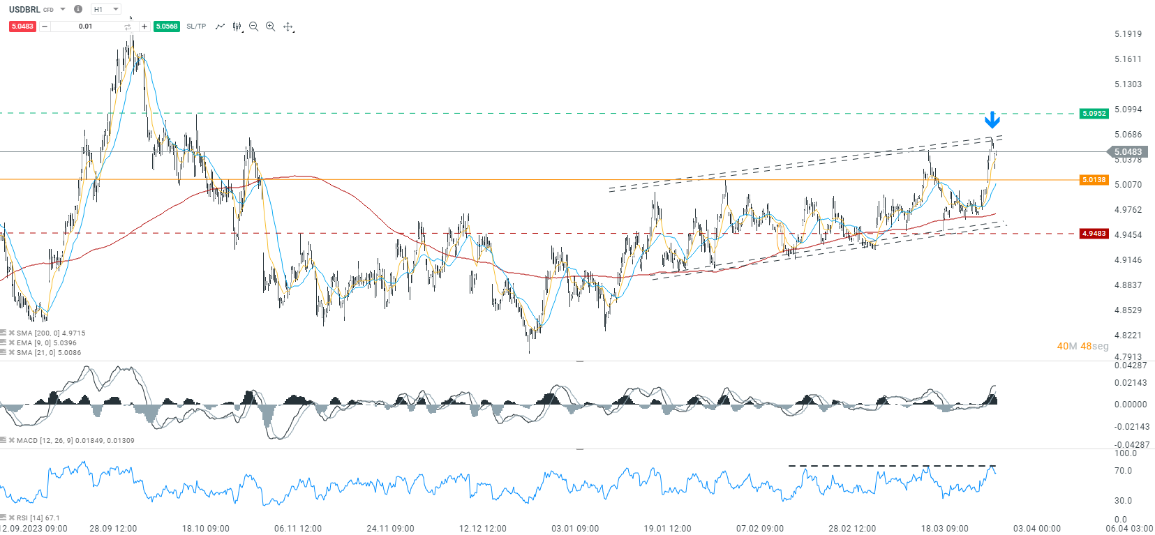 El tipo de cambio en Brasil continua dentro del canal alcista, aunque se encuentra en el retroceso, ubicando el precio actualmente en los 5.0485 y actualmente intenta cruzar las medias moviles de corto plazo, confirmando que la correccion no ha terminado. Si el precio logra mantenerse sobre los 5.0138 podria intentar llegar al objetivo de los 5.0952, en el caso de una ruptura del nivel clave, podriamos ver una aproximacion en torno a los 4.9483.