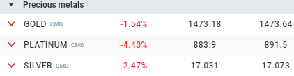 Se ha visto una fuerte venta en los metales preciosos en la negociación reciente con oro por debajo de la marca de $ 1480 / oz que desencadena una ola de órdenes de venta en los mercados. El oro ha caído a su nivel más bajo desde principios de agosto y ha bajado un 1,5% en el día en el momento de la escritura. Sin embargo, los otros mercados se han visto más afectados, con el platino cayendo más del 4% y la plata en un 2,5%.