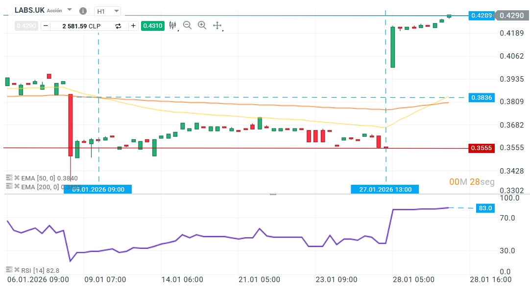 Para que se produzca un indicio real de reversión o cambio de tendencia, la acción tendría que retroceder hasta perforar el nivel de los 38,36p, zona que marcó el cruce de medias anterior el pasado 9 de enero. Mientras el activo se sostenga sobre este soporte, el mercado continuará validando el sesgo alcista derivado del anuncio corporativo, ignorando la sobreextensión del oscilador en favor de la solidez de la oferta actual.