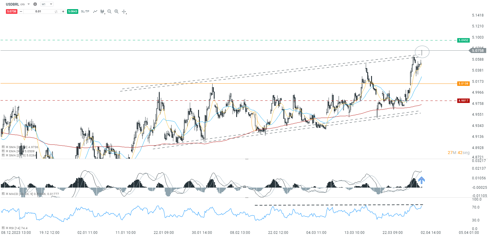 El tipo de cambio en Brasil abrió al alza en la sesión del miércoles por la mañana, tras la publicación de los datos de producción industrial, los cuales mostraron un deterioro en el índice del -0.3% en términos mensuales. Este deterioro de la moneda local llevó al tipo de cambio a ubicarse actualmente en los 5.0740, marcando una ruptura del canal alcista, teniendo como objetivo clave los 5.0952.
