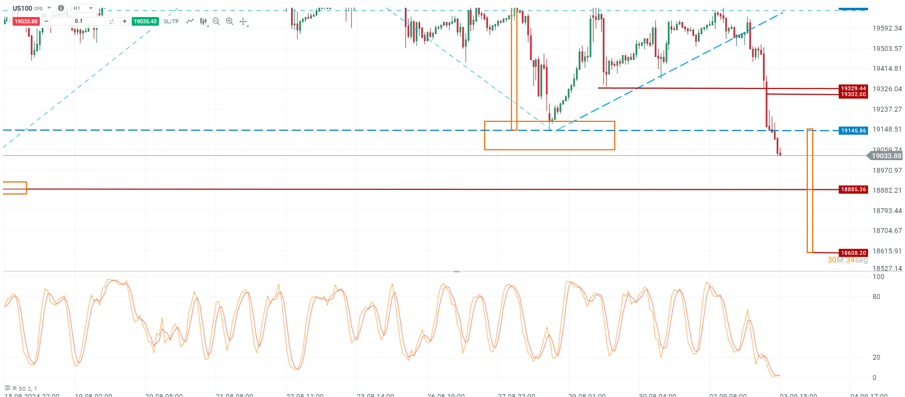 Nasdaq pierde bruscamente la zona de los 19145 y se dirige firmemente hacia la zona de los 18885 como uno de los puntos de reversion mas importantes antes de llegar a los maximos anteriores. Si bien el estocastico busca una reversion alcista aun no la encuentra y si el mercado suma mas fuerza bajista puede que ese repunte se vea mitigado y desplazado a una caida mas extrema hacia los 18608. Los datos de empleo podrian recomoponer estas caidas.