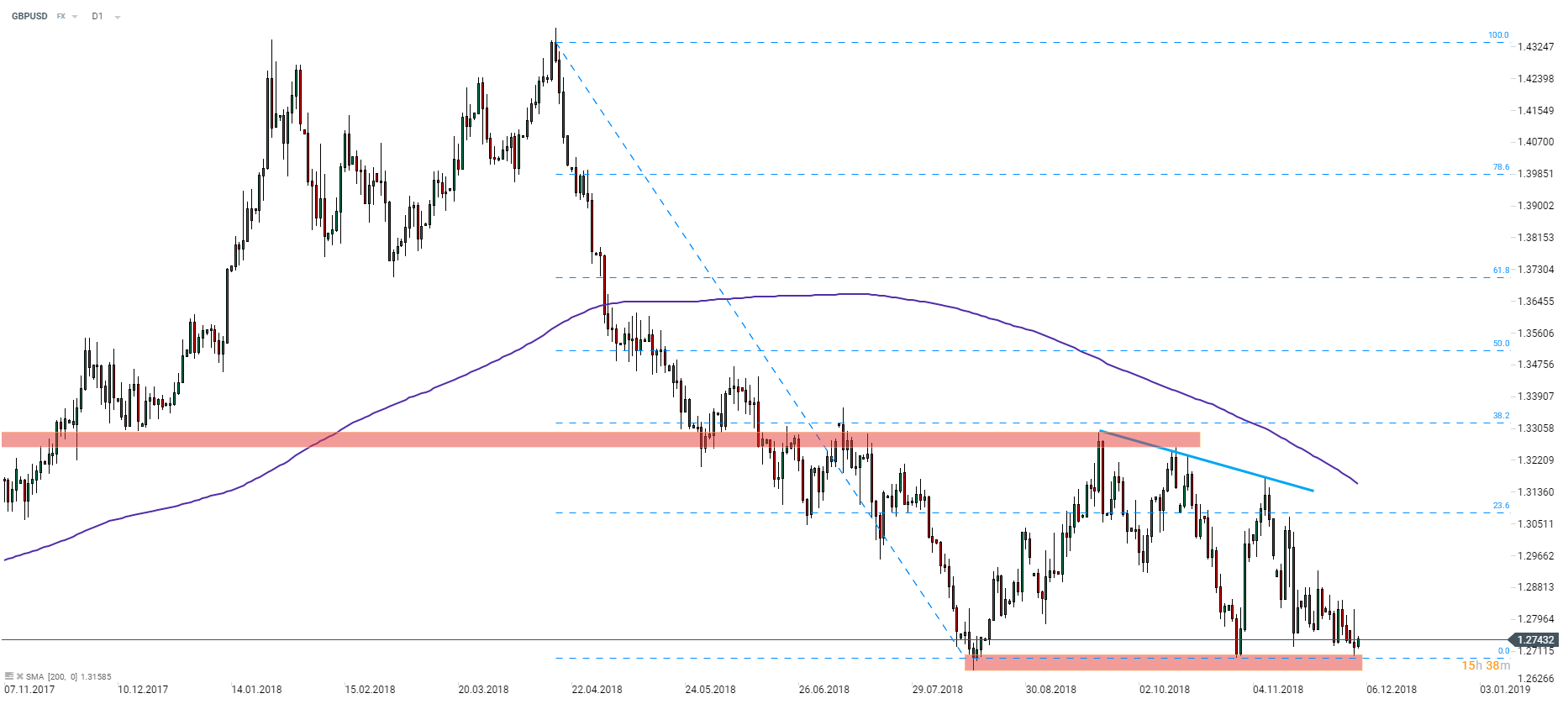 Tras pintar tres mínimos máximos consecutivos, el GBPUSD se retiró hacia la zona de soporte por debajo de los 1.2700. El par permanece bajo presión por la incertidumbre del proceso del Brexit y la votación. Los datos de hoy y el discurso de Carney podrían ofrecer un alivio a los alcistas del GBP. Fuente: xStation5