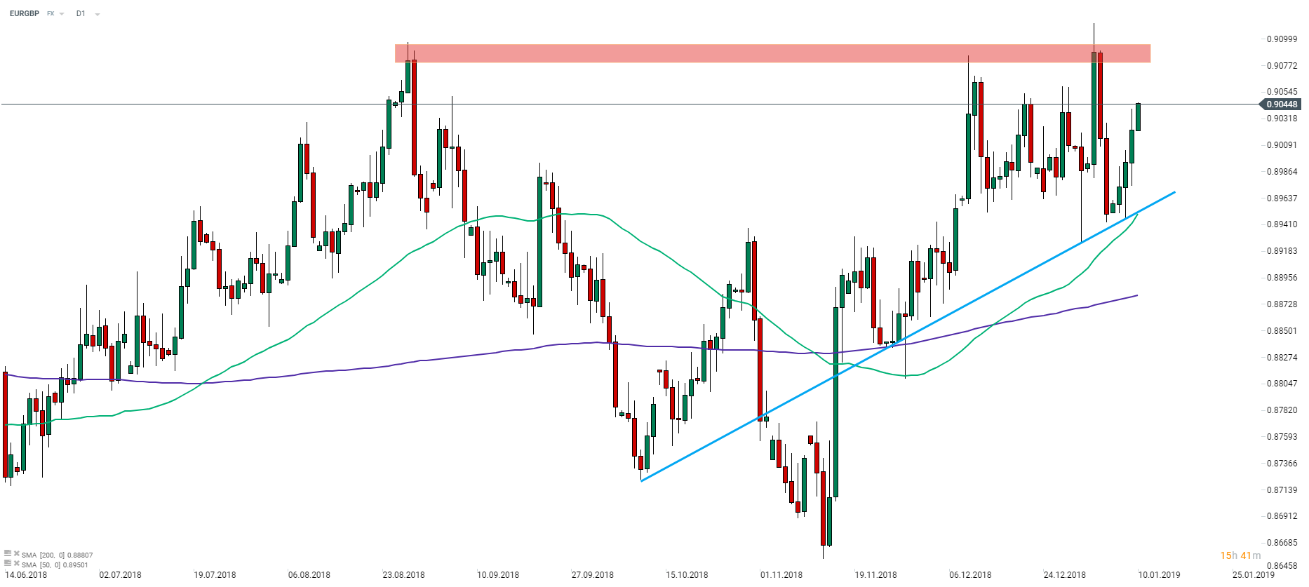 El EURGBP rebotó de la tendencia alcista y parece estar mirando a otro ataque al rango de resistencia por encima de los 0.9080. El par podría estar más sensima pro la tarde cuando se publicarán las actas de la última reunión del BCE. Fuente: xStation5