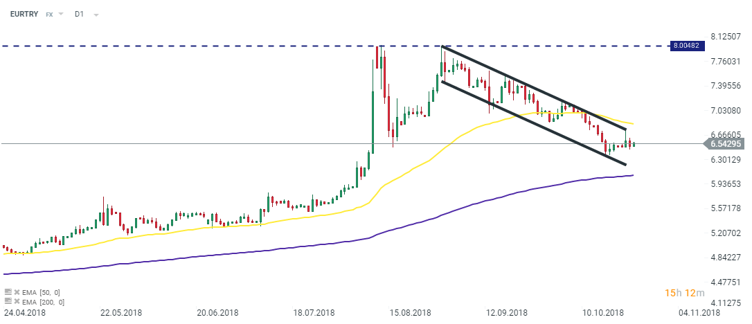El EURTRY ha estado cayendo desde finales de septiembre. La liberación del pastor Brunso sin dudo ha ayudado a apoyar la lira turca. El par está operando alrededor de los 6.55 a jueves por la mañana. Fuente: xStation5