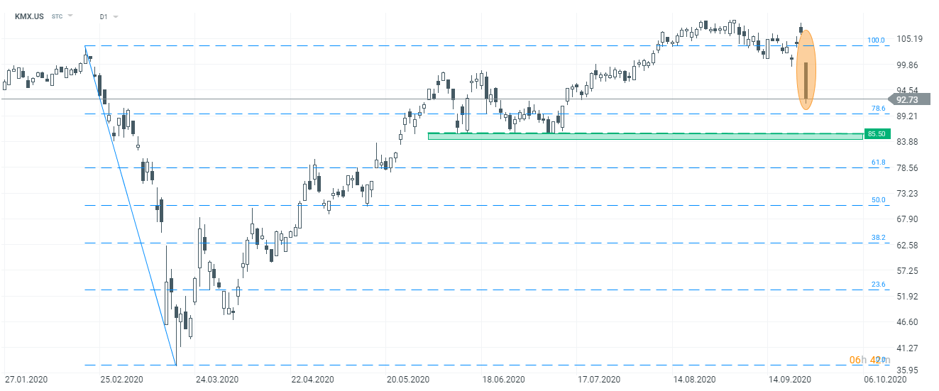 CarMax (KMX.US) abrió sorprendentemente con una enorme brecha bajista a pesar de unos resultados mejores de lo esperado. La acción se ha acercado al 78,6% de retroceso de Fibonacci de la caída de febrero a marzo. El área de $ 85.50 puede verse como un nivel de soporte clave. Fuente: xStation5.