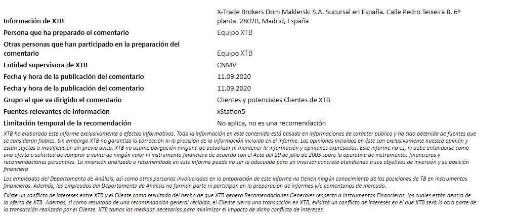 "Este informe se proporciona sólo con fines de información general y con fines educativos. Cualquier opinión, análisis, precio u otro contenido no constituyen asesoramiento de inversión o recomendación en entendimiento de la ley de Belice. El rendimiento en el pasado no indica necesariamente los resultados futuros, y cualquier persona que actúe sobre esta información lo hace bajo su propio riesgo. XTB no aceptará responsabilidad por ninguna pérdida o daño, incluida, sin limitación, cualquier pérdida de beneficio, que pueda surgir directa o indirectamente del uso o la confianza de dicha información. Los contratos por diferencias (""CFDs"") son productos con apalancamiento y acarrean un alto nivel de riesgo. Asegúrese de comprender los riesgos asociados. "