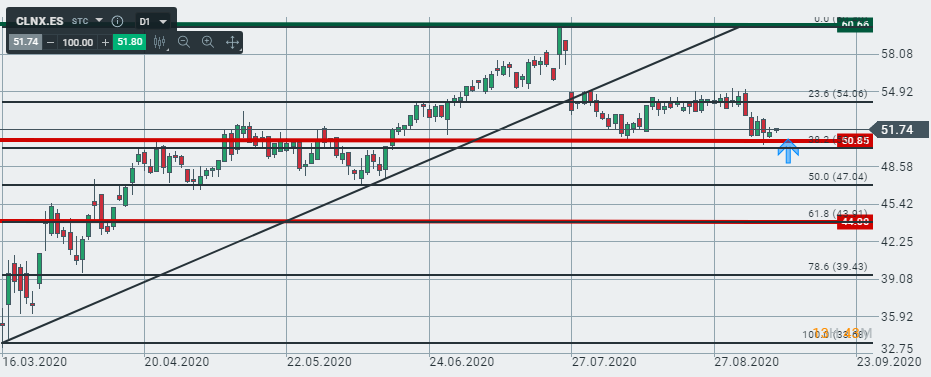 Cellnex continúa dibujando una tendencia alcista impecable con un primer soporte de corto plazo en los 50,85 euros. Su eventual ruptura implicaría una corrección hacia los 44,00, en la medida en que este se perfore no tendremos la más mínima señal de debilidad en el título, ni siquiera de corto plazo. , aun asi no observamos síntomas de agotamiento de tendencia además de experimentar un aumento en los volúmenes de contratación. La actual correcion hasta el nivel 38.2 de Fibonacci, supone una gran oportunidad de entrada en el valor, marcando el objetivo en el último máximo histórico
