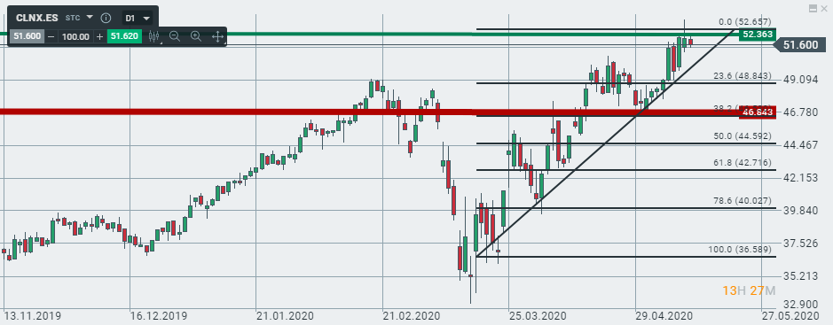 La cotización de Cellnex tiene un escenario positivo en el corto plazo, donde el soporte de los 46,80 ha servido a la acción para tomar impulso y volver a la senda positiva, reforzando así canal alcista por el que se viene desplazando el precio desde los mínimos de marzo. El próximo objetivo a tener en cuenta es la , una vez roto el nivel de los 50,80 euros, la consolidación del los 51 euros por acción, esperando que se produzca un aumento del volumen de contratación y mantener la condición de subida libre.