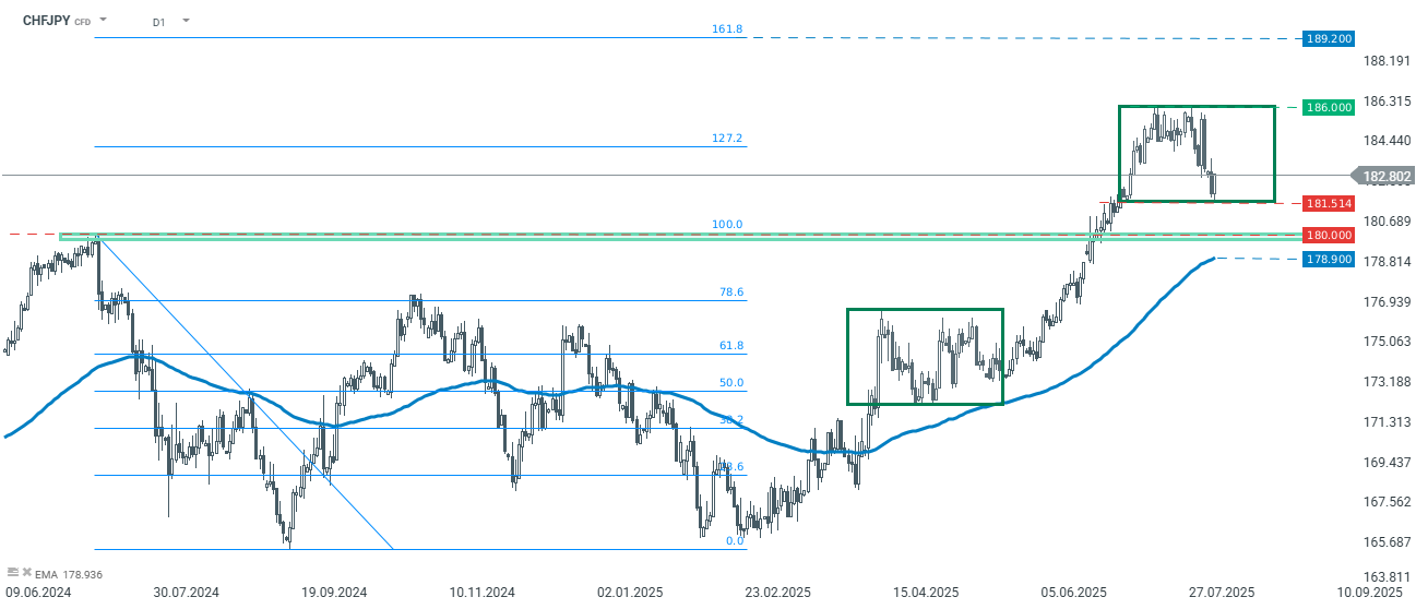 Las cotizaciones del franco suizo/yen japonés han estado en tendencia alcista desde finales de febrero. Al observar el intervalo diario (D1), el tipo de cambio sufrió una corrección bajista que alcanzó un soporte clave en el nivel de 181,50, donde se sitúa el límite inferior de la formación 1:1 (rectángulo verde), la mayor corrección dentro del impulso alcista mencionado. Según la metodología Overbalance, mantener ese soporte podría anticipar la reanudación de la tendencia al alza. En ese escenario, un movimiento hacia 188,00 es factible.