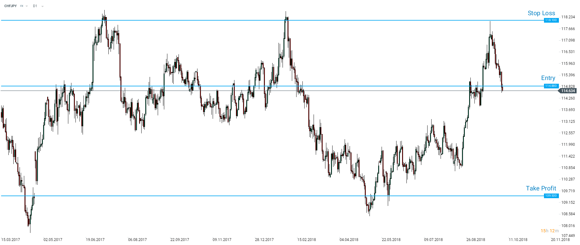 Morgan Stanley recomienda posicionarse corto en CHFJPY con un objetivo de 109.50 y un stop en 118.10. Fuente: xStation5