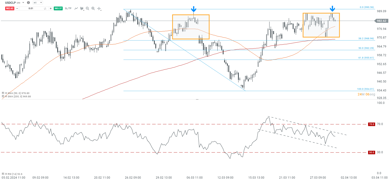El tipo de cambio chileno se fortaleció gracias a una producción de cobre más abundante, la cual actuó como el principal catalizador para que el precio se mantuviera fluctuando entre los rangos de 940 y 990. Actualmente, el precio se sitúa en 982, cifra que está muy cerca de las medias móviles de mediano y largo plazo. Un cruce con las medias SMA de 50 y 200 podría indicar un posible retroceso mayor. El oscilador RSI se encuentra en una tendencia bajista en el momento, lo que sugiere que podríamos observar correcciones más significativas durante la jornada.