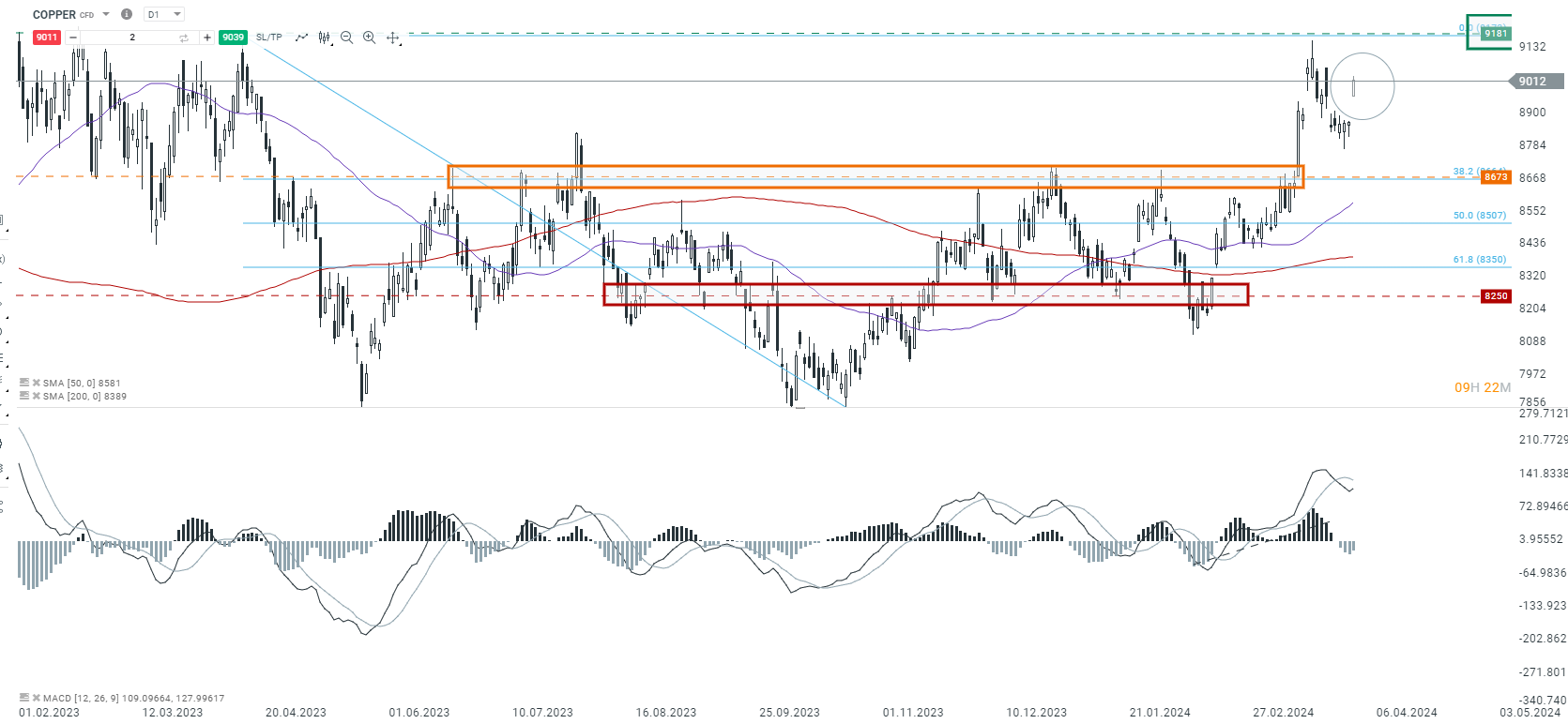 Tras superar la fase de lateralización en los rangos de 8250 a 8670, el cobre ha ingresado en una nueva zona, situándose alrededor de los 9000. Si el precio logra mantenerse por encima del nivel clave de 8673, podríamos presenciar una continuación del impulso hacia los 9181.