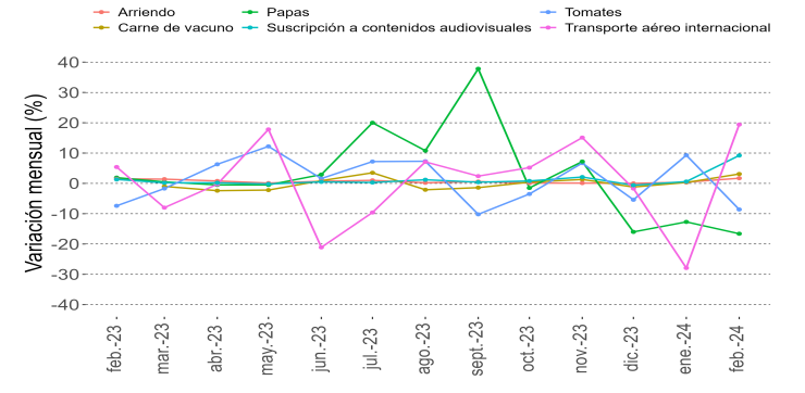 - Recreación, deportes y cultura: Disminuyeron en -0,4%, lo que refleja una caída en los precios de actividades de ocio.