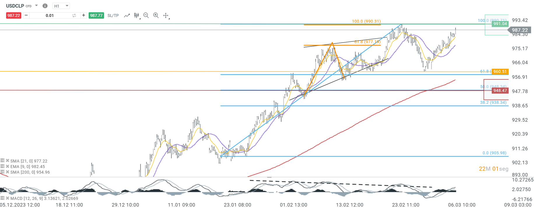 La Balanza Comercial presenta un superávit en febrero, estamos viendo que la cantidad tanto importada como exportada ha disminuido, por lo tanto, si bien Chile registró un superávit, la disminución en la magnitud de este superávit puede sugerir que las expectativas de los inversionistas y operadores de mercado se han ajustado, posiblemente debido a una visión menos optimista del comercio futuro o de la economía en general. La cantidad disminuida del superávit, aunque aún positiva, puede no haber cumplido con las expectativas del mercado, lo que podría contribuir a una percepción de debilidad económica o de disminución en la demanda externa por productos chilenos. Fuente: xStation 5