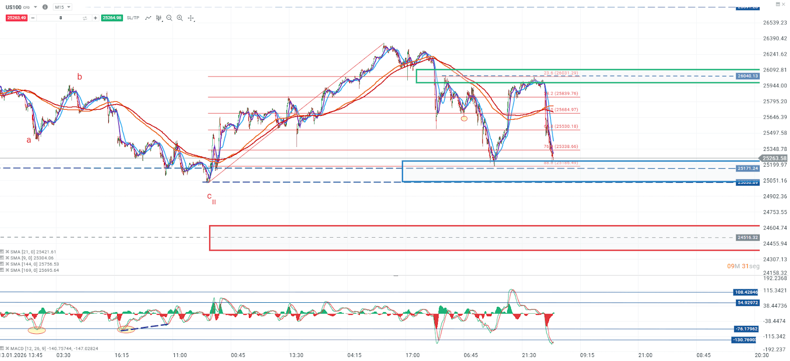 El nivel clave se mantiene en la zona de 25.171, donde el MACD refleja un marcado estado de sobreventa. Si el precio logra sostener este soporte, podría activarse un rebote correctivo que acerque la cotización nuevamente hacia 26.040. No obstante, una ruptura clara de 25.171 aumentaría la probabilidad de una extensión de las caídas, en el siguiente soporte relevante en torno a 24.516.