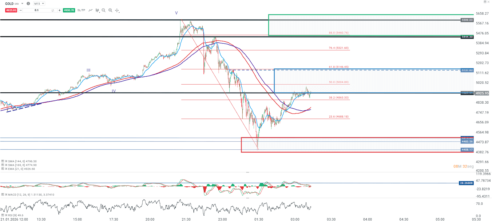 El oro ha rebotado desde los mínimos semanales en torno a 4.408 y se ha extendido hasta alcanzar la resistencia correspondiente al 50% de Fibonacci. Pese a este avance, el activo mantiene una estructura técnica favorable, respaldada por el cruce y la pendiente positiva de la media móvil de largo plazo, lo que sugiere continuidad del impulso alcista.