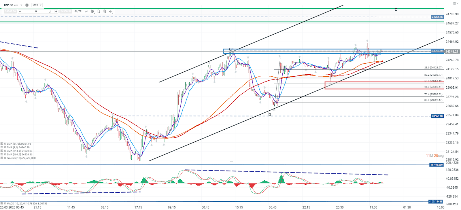 En este contexto, el nivel de 24.353 se mantiene como una referencia clave. Una superación y posterior consolidación por encima de este nivel podría respaldar la continuidad del canal hacia la zona de 24.766. Por el contrario, una consolidación por debajo de dicha resistencia podría dar paso a un movimiento correctivo de mayor amplitud, aproximando el precio hacia el soporte de 23.888, correspondiente al retroceso del 61,8% de Fibonacci.