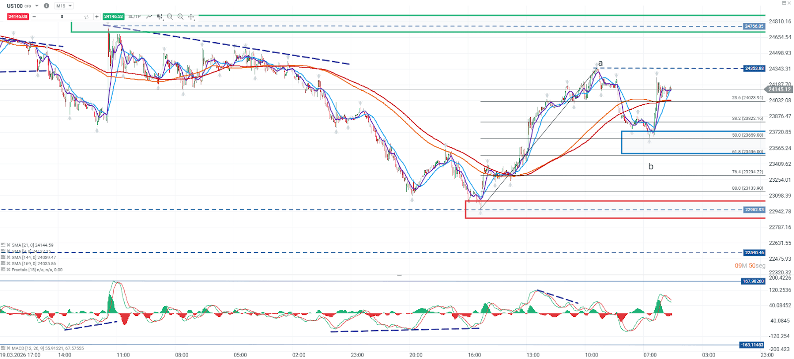 El US100 encontró soporte en el retroceso del 50% de Fibonacci (23.659), nivel desde el cual inició un repunte impulsivo que llevó al precio hasta la zona de los 24.353, correspondiente a los máximos previos. Sin embargo, este nivel ha actuado como una resistencia firme que el precio no ha logrado superar, generando rechazo en esa área y frenando el impulso alcista de corto plazo.