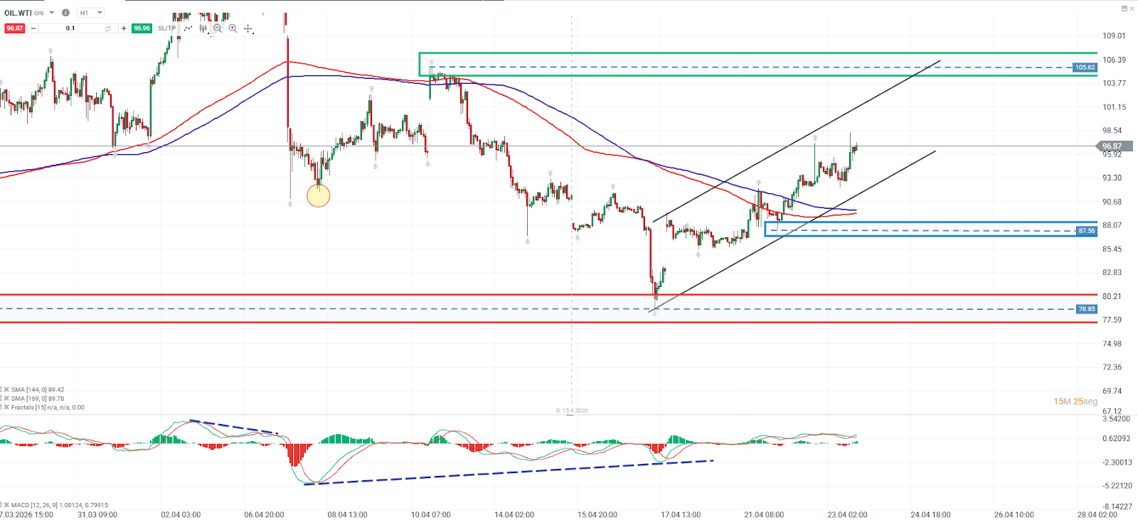 Bajo este escenario, la permanencia sobre los 87,56 podría favorecer una extensión del movimiento hacia la resistencia principal ubicada en torno a los 105,12. En contraste, una ruptura de este soporte abriría la puerta a una posible reversión del movimiento alcista, teniendo como referencia un nivel pivote inferior en la región de los 78,85.