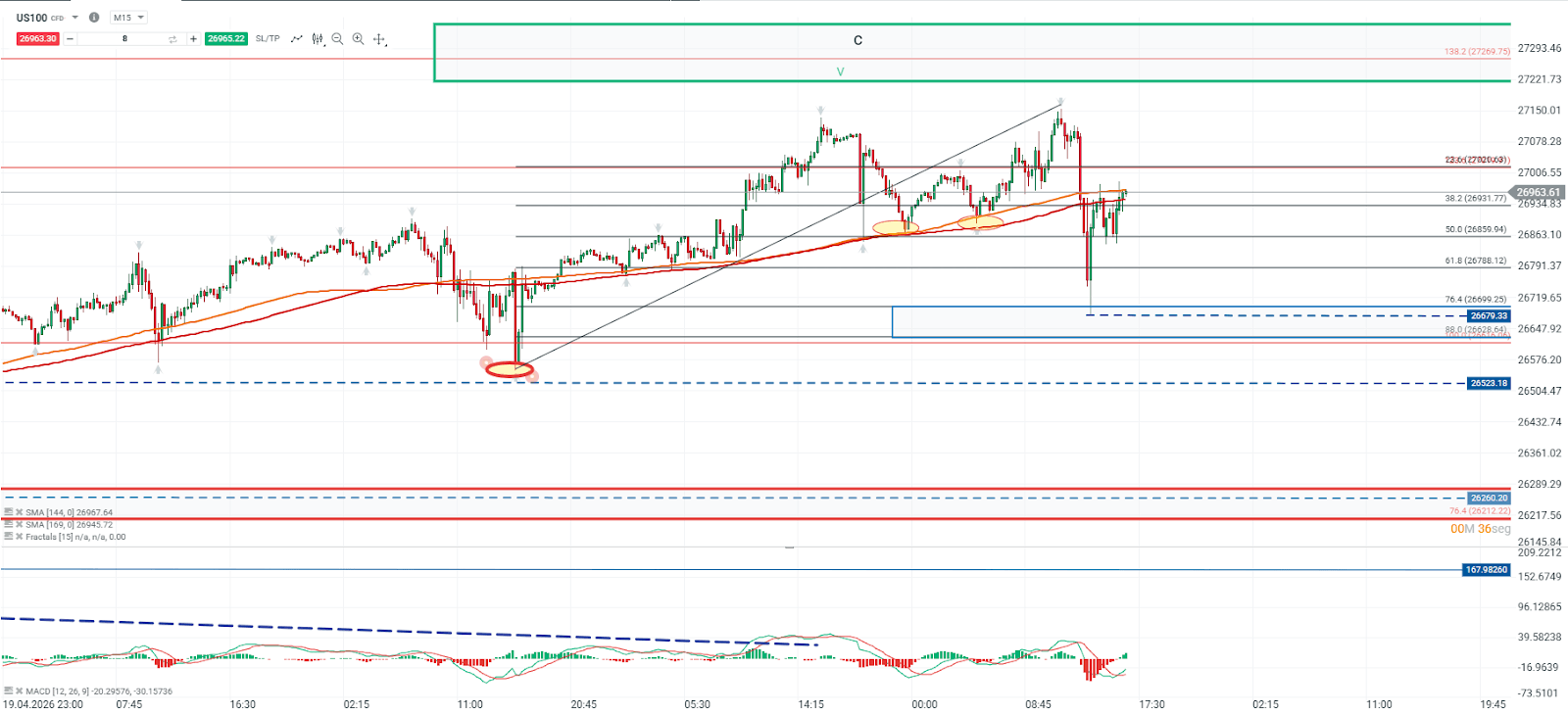 El índice Nasdaq 100 ha evidenciado un escenario de presión bajista, al no lograr sostener la ruptura de su máximo previo. Como consecuencia, el precio ha retrocedido hacia la zona correspondiente al 75,4% de retroceso de Fibonacci, ubicada en torno a los 26.679 puntos. Este nivel se configura como un soporte crítico dentro de la estructura actual.