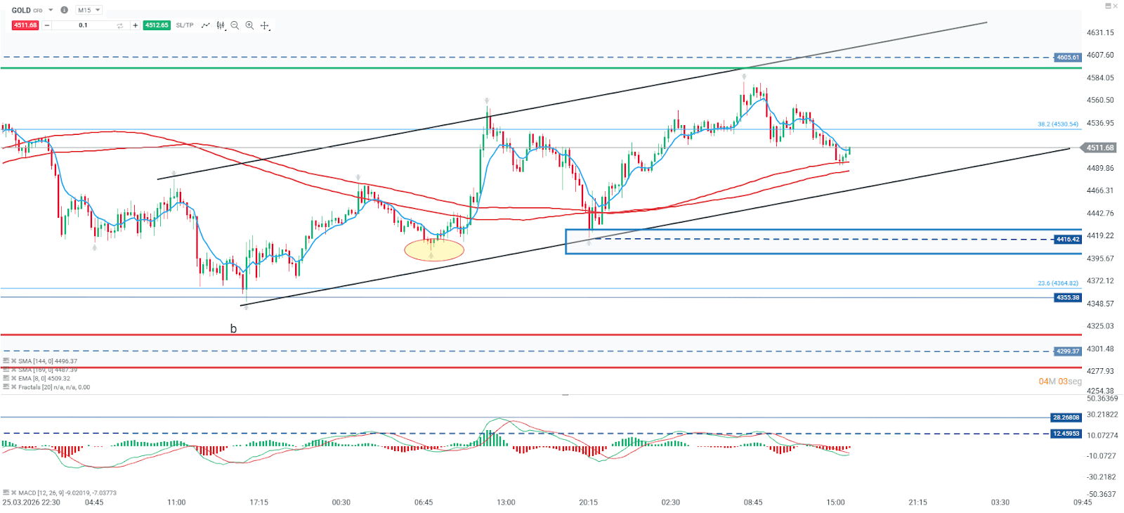 El punto pivote clave se ubica en la zona de los 4.416, que coincide con un área de demanda previa claramente marcada en el gráfico. Si el precio logra mantenerse por encima de este nivel, la estructura alcista seguiría vigente en donde la resistencia más relevante se ubica en los 4.605, cercana a la parte alta del canal. Adicionalmente, el retroceso de Fibonacci del 38,2% en los 4.530 funciona como resistencia intermedia a superar. Por el contrario, una pérdida confirmada del soporte de los 4.416 invalidaría el canal ascendente y abriría el camino hacia una extensión bajista con objetivo en la zona de los 4.299, retomando la presión vendedora previa.