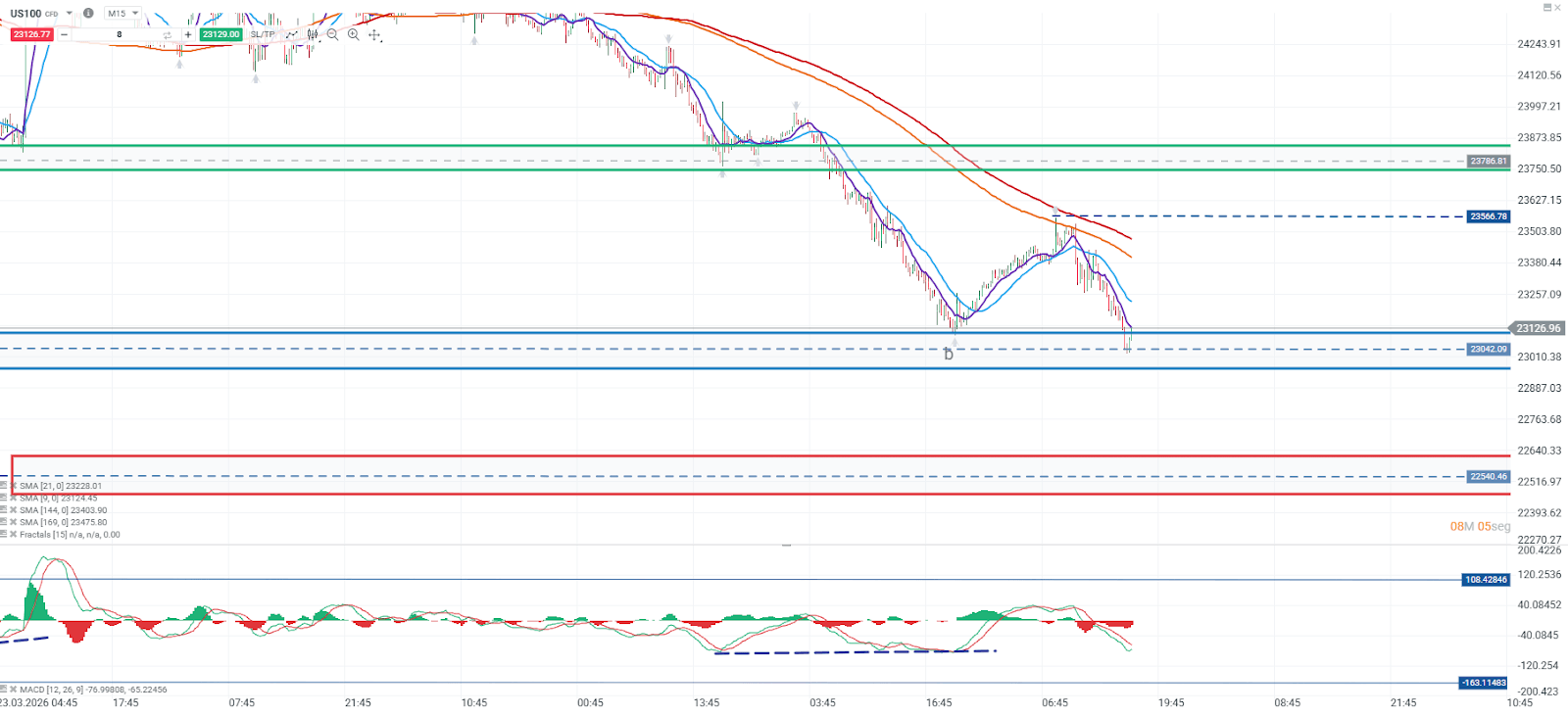 El US100 ha vuelto a testear el soporte clave de los 23.042 puntos, registrando un nuevo mínimo en la sesión. Aunque el MACD muestra una divergencia alcista, el precio se mantiene por debajo de sus medias móviles principales, lo que confirma que la estructura bajista sigue vigente en el corto plazo.