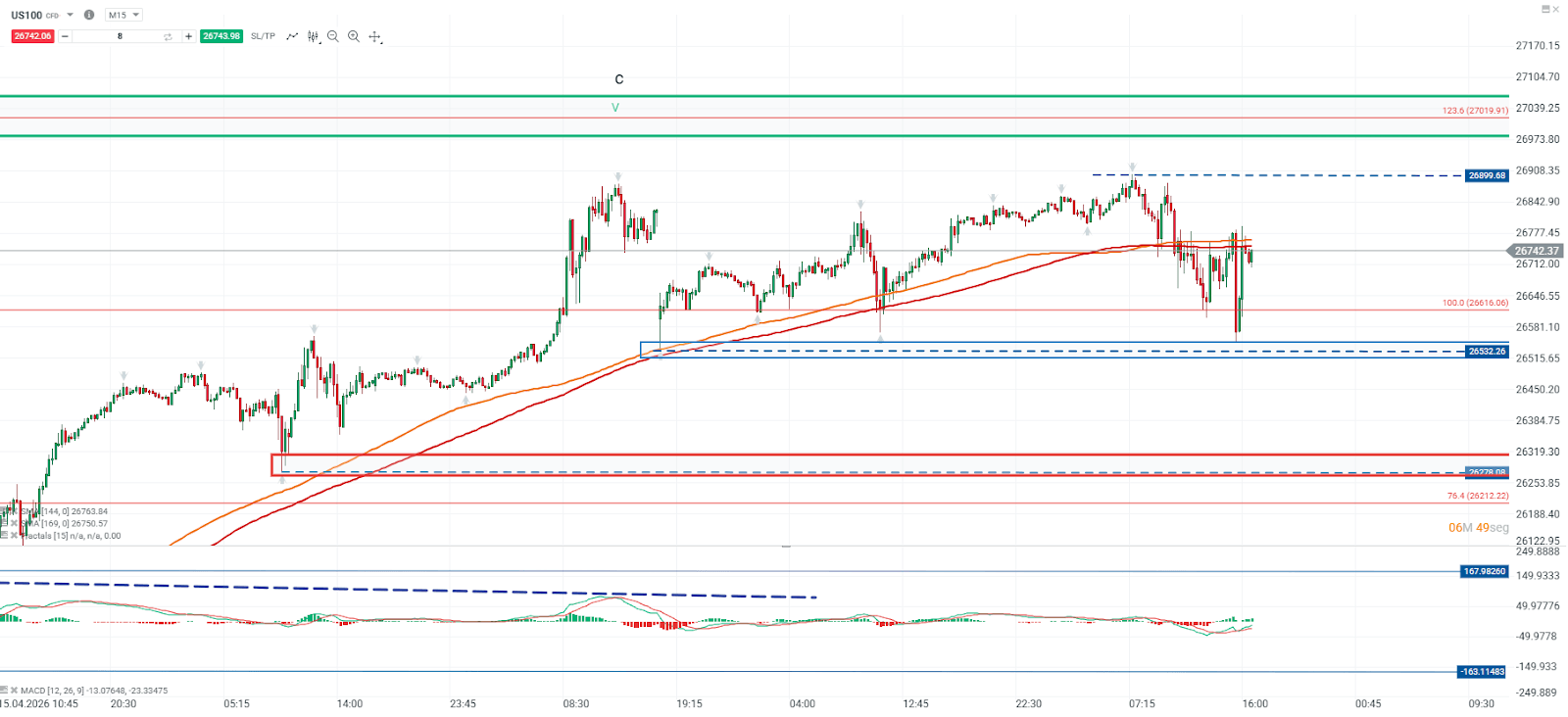 El Nasdaq 100 ha mantenido una estructura de rango lateral, evidenciando episodios de volatilidad durante la sesión. A pesar de ello, el precio ha respetado su punto pivote en torno a los 26.532, el cual continúa siendo la principal referencia técnica. Esta dinámica se ve respaldada por el comportamiento de las medias móviles, que se encuentran interactuando estrechamente con el precio, confirmando el escenario de consolidación.