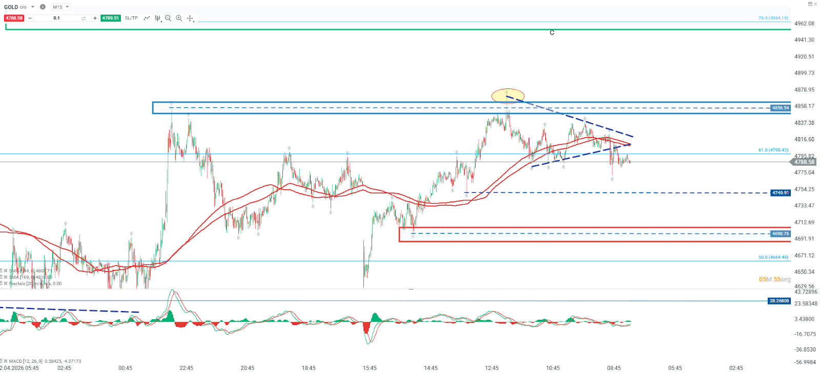 Mientras el precio se mantenga por debajo de los 4.856, el precio podría continuar con su movimiento correctivo, teniendo como soporte relevante la zona de los 4.698 dólares por onza. No obstante, una eventual superación de la resistencia podría invalidar este escenario y habilitar una extensión alcista hacia la resistencia de los 4.964 dólares por onza.