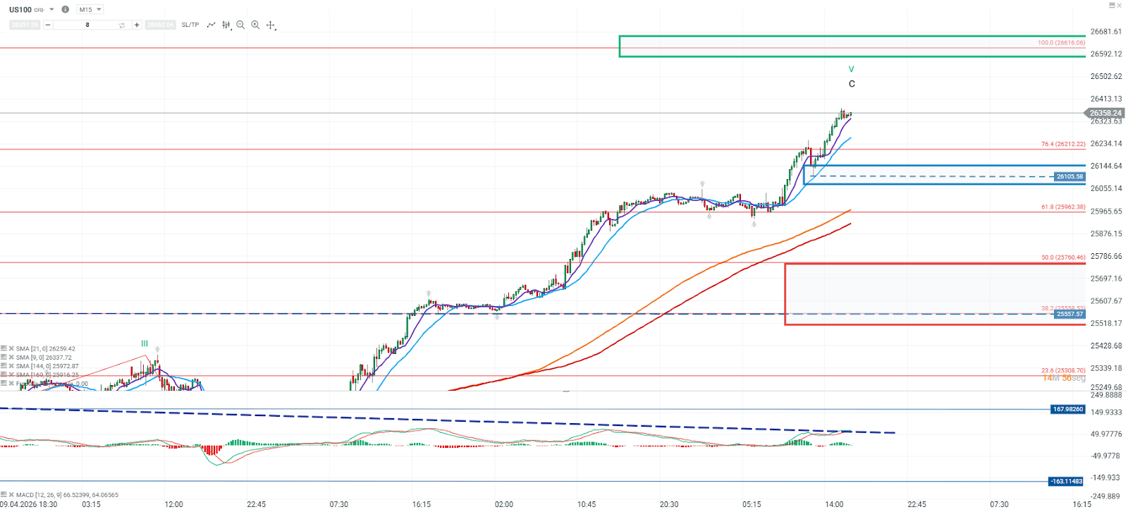 No obstante, el indicador MACD presenta una divergencia bajista, lo que introduce una señal de cautela. Aun así, mientras el precio se mantenga sobre sus medias móviles de corto plazo y el soporte de 26.105, es factible proyectar una extensión del movimiento hacia la zona de 26.616, correspondiente al 100% de extensión de Fibonacci. En caso de perder este soporte, se incrementaría la probabilidad de una corrección más profunda, con un próximo nivel de soporte relevante en torno a 25.760.