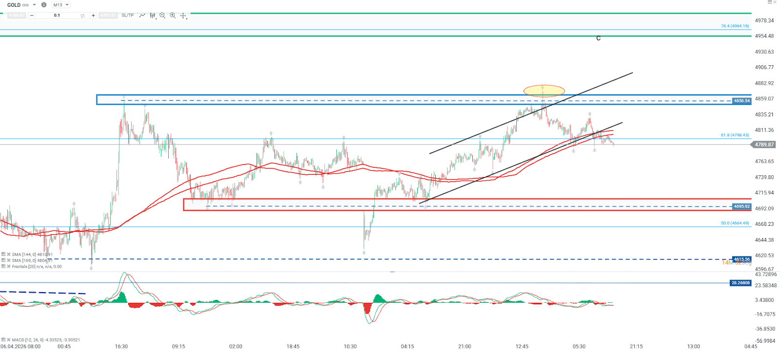 Mientras el precio se mantenga por debajo de dicho nivel, es probable que continúe la presión bajista, teniendo como soporte relevante la zona de 4695. Por el contrario, una superación clara de la resistencia en 4856 podría habilitar un escenario de recuperación, con una posible extensión hacia los 4964, nivel que coincide con una resistencia significativa asociada a retrocesos de Fibonacci.