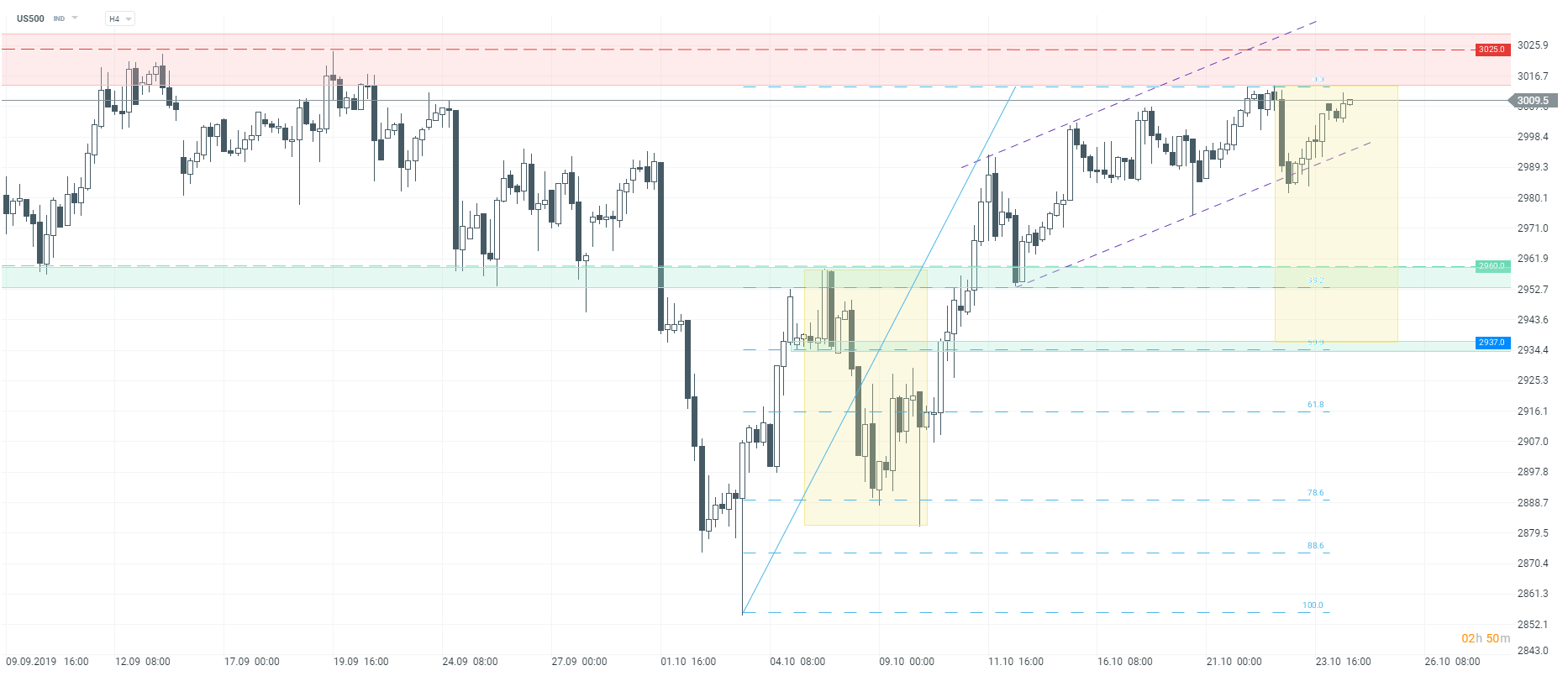 US500 (S&P 500 futuros subyacentes) cotiza dentro de un canal ascendente durante dos semanas. Sin embargo, la zona que se encuentra cerca de los máximos históricos logró detener el índice a principios de esta semana. Esta es la resistencia final para el índice, ya que romper arriba significaría navegar en aguas desconocidas. Cuando se trata de niveles de soporte para observar, el primer obstáculo a corto plazo se puede encontrar en 2995 pts, el límite inferior del canal ascendente. Sin embargo, el soporte clave, 2937 pts, es significativamente menor. Este nivel está marcado con el límite inferior de la estructura Overbalance (recuadro amarillo) y su ruptura por debajo sugeriría, en teoría, una inversión de tendencia. Fuente: xStation5