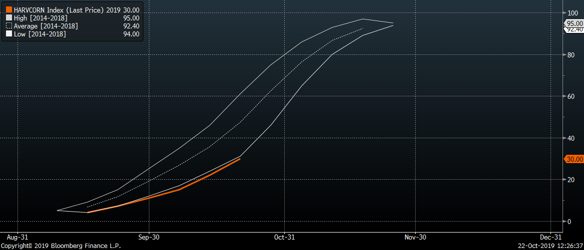 - Ya se ha cosechado hasta el 30% del maíz, mientras que la media de 5 años está en el 45%. El progreso de la cosecha de este año parece estar en línea con el mínimo de 5 años.