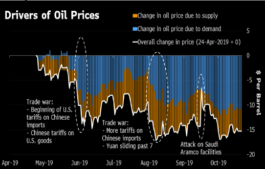 - Bloomberg desglosa el cambio actual del precio del petróleo y señala en qué medida la demanda y la oferta se ven afectadas (el cuadro a continuación)
