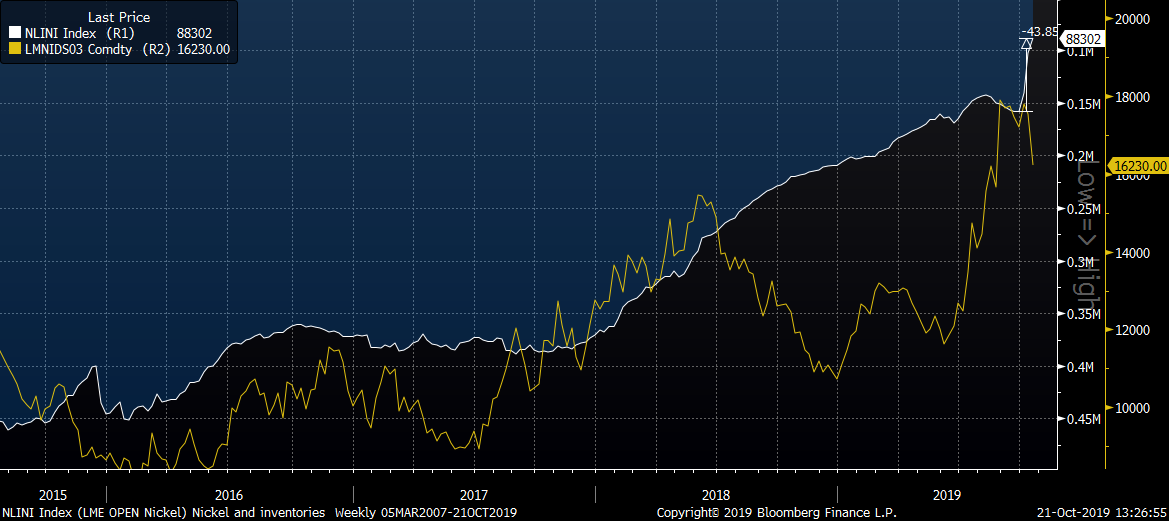 Las existencias de níquel en LME disminuyeron casi un 45% en la semana anterior. Se dice que la caída de precios que se acompaña es una respuesta a las preocupaciones de la demanda. Fuente: Bloomberg