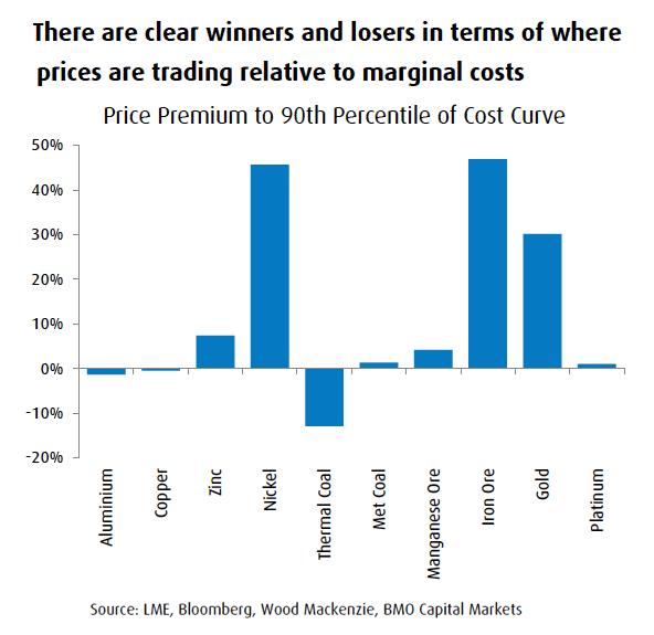 Los productores de níquel, mineral de hierro y oro están en la mejor posición en términos de costes. Aproximadamente el 10% de los productores de cobre no logran alcanzar el punto de equilibrio. Fuente: BMO