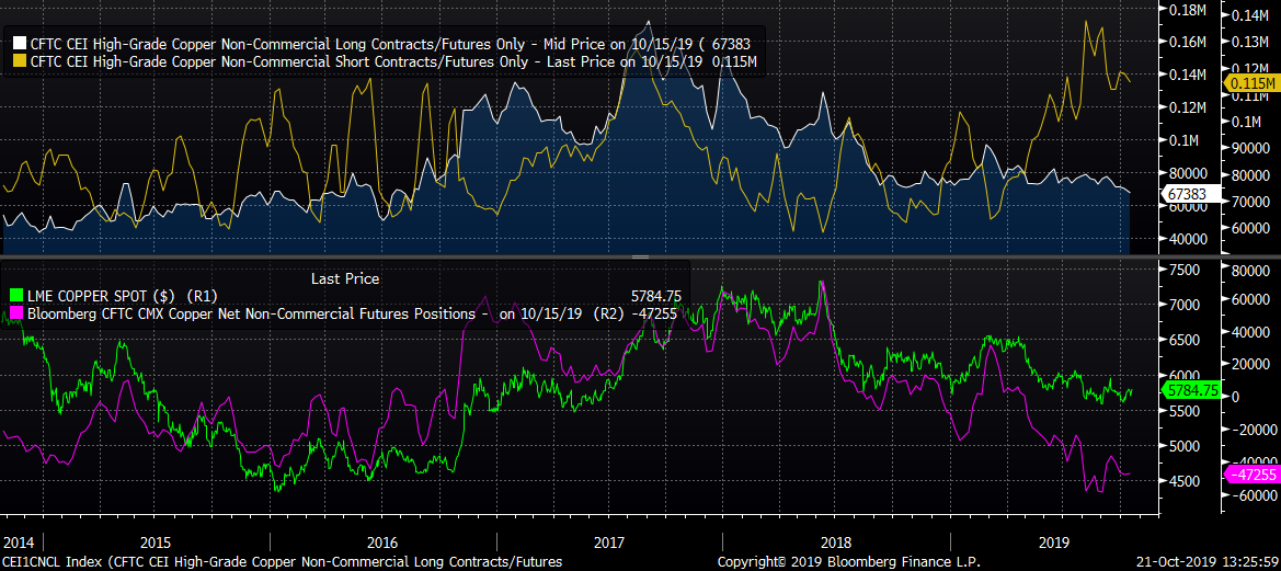 - La posición neta especulativa se mantiene cerca de los mínimos históricos, dando lugar a un posible rebote una vez que Estados Unidos y China lleguen a un acuerdo comercial.