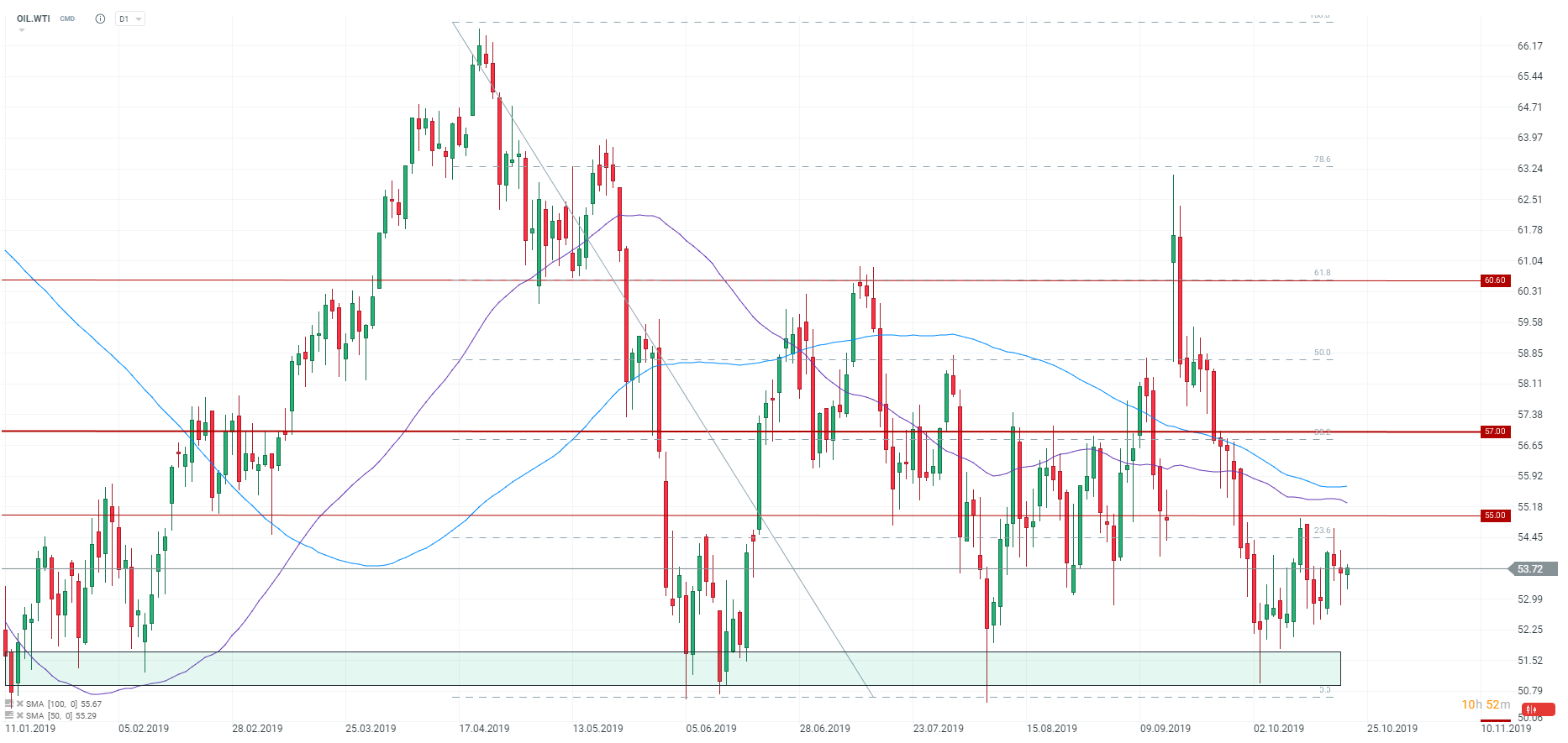 - Los precios del petróleo siguen moviéndose dentro de una consolidación entre $ 51 y $ 55 (WTI)