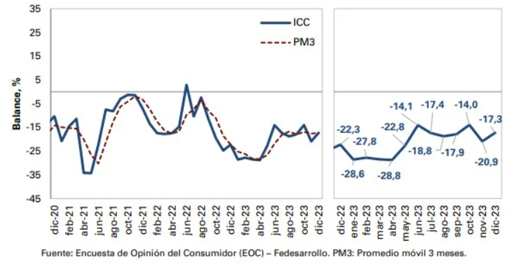 La confianza del consumidor en Colombia mejoró levemente en diciembre de 2023, al ubicarse en -17,30 puntos, frente a los -20,90 puntos de noviembre del mismo año. Sin embargo, el indicador sigue en terreno negativo.