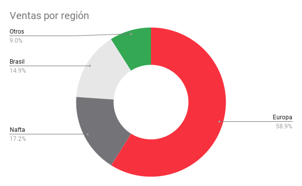 La empresa cuenta con una buena diversificación geográfica, puesto que la región que mayor peso tiene en los ingresos es Europa, pero está ubicada en diferentes países del continente. La distribución de sus ingresos es la siguiente: