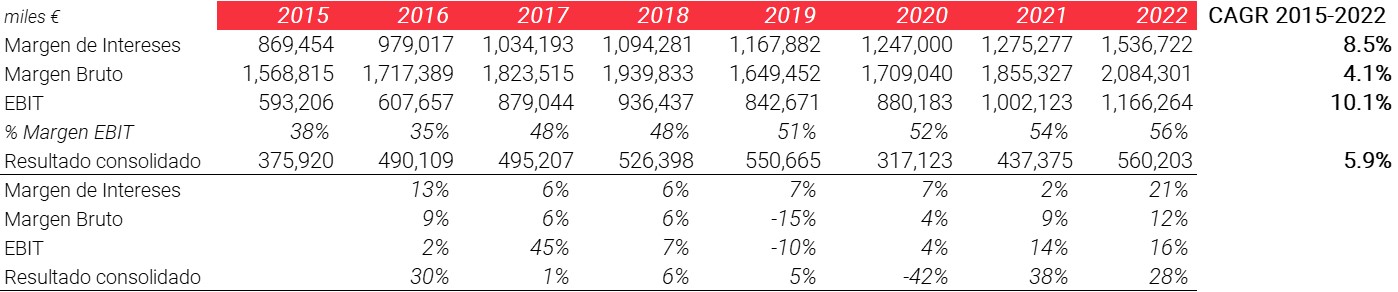 Actualmente cuenta con una cartera de préstamos de 74.600 millones de euros y unos depósitos de clientes de 72.900 millones de euros. Además, gracias a su perfil conservador ha conseguido situarse como uno de los bancos más rentables del sector, con un ROE de más del 11% en 2022 y ha conseguido mantener ese retorno por encima del 10% o cercano a el durante los últimos años.