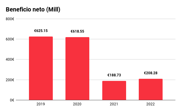 La empresa lleva años publicando unos muy malos resultados, e incluso este 2023 si miramos el beneficio neto e incluimos los gastos excepcionales (que cada año reporta alguno), este cae un -98%.