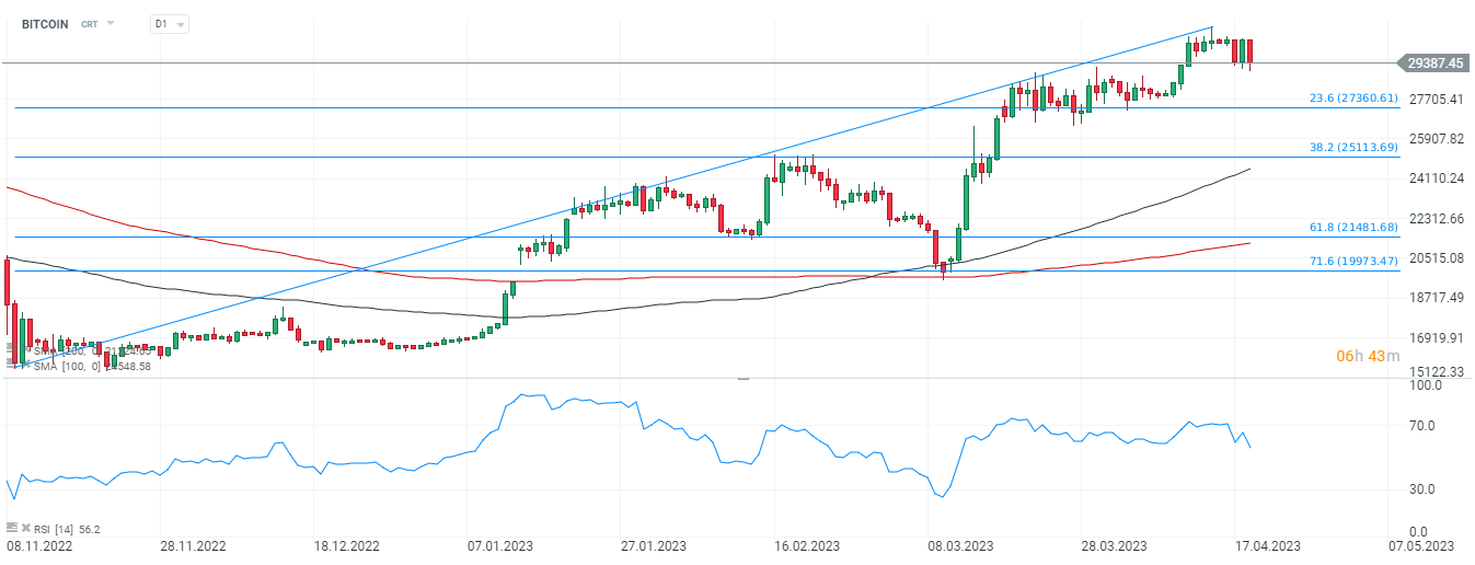 BITCOIN, intervalo D1. La principal criptomoneda ha sido empujada una vez más desde el nivel de los $ 30,000, lo que indica un posible telón de fondo para una corrección mayor del enorme movimiento ascendente. Si las caídas se profundizan, el retroceso de Fibonacci de 23,6 de la ola alcista, que comenzó en noviembre de 2022, en $27400, y la SMA de 100 (línea negra), que puede superponerse con el Fibonacci de 38,2 en la zona psicológica de $25000, pueden resultar siendo importantes niveles Fuente: xStation5