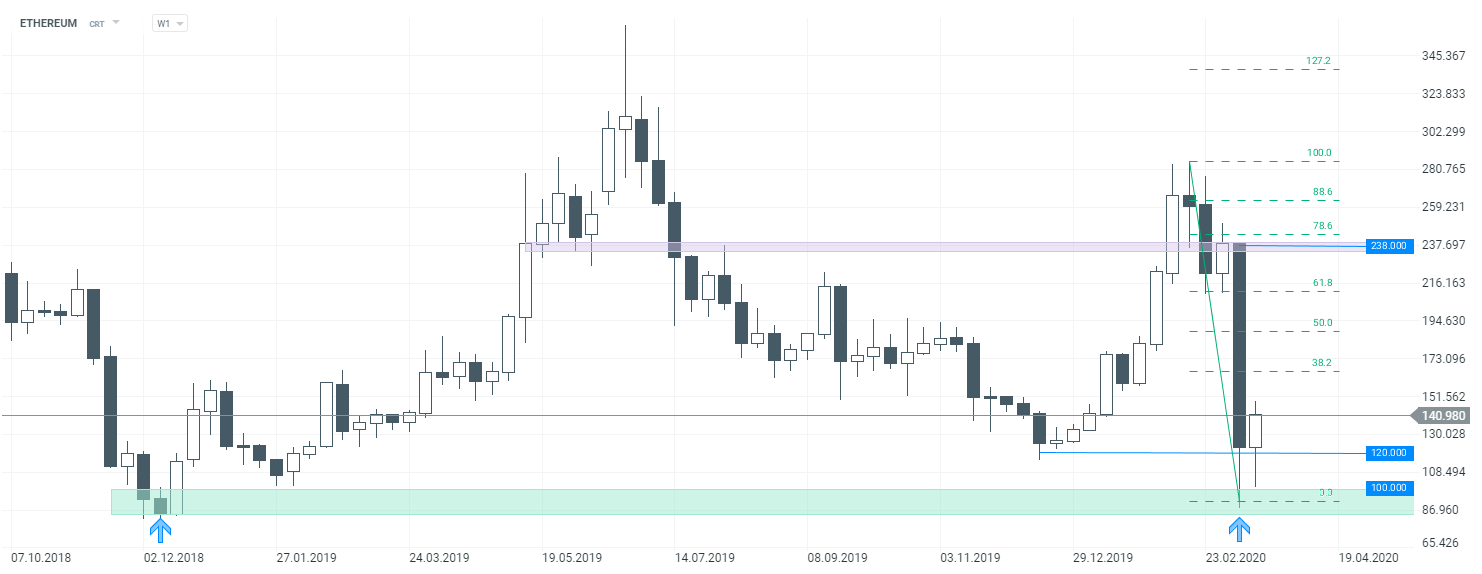 Mirando la segunda criptomoneda más grande: Ethereum, el precio cayó más del 50% la semana pasada. Sin embargo, la caída se detuvo en el nivel de la ronda 100, donde se ubican los mínimos de finales de 2018. Un rebote aquí puede alentar a los compradores a ser más activos, pero vale la pena esperar a que se cierre la vela semanal. Si la vela después del cierre tendrá un cuerpo blanco, entonces existe la posibilidad de una mayor corrección hacia arriba. Por otro lado, si el precio vuelve por debajo de $ 120, esto puede generar otro impulso a la baja.