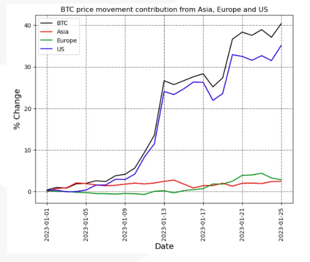 Las ganancias de Bitcoin ocurren principalmente durante la sesión de EE. UU., lo que indica una correlación con los índices de Wall Street y el interés de los inversores estadounidenses. La especulación del criptomercado indica que la actividad de los inversores institucionales de EE. UU. frente a los inversores minoristas se ha visto debilitada por la inflación, las tasas de interés y las caídas de 2022. Fuente: Cointelegraph