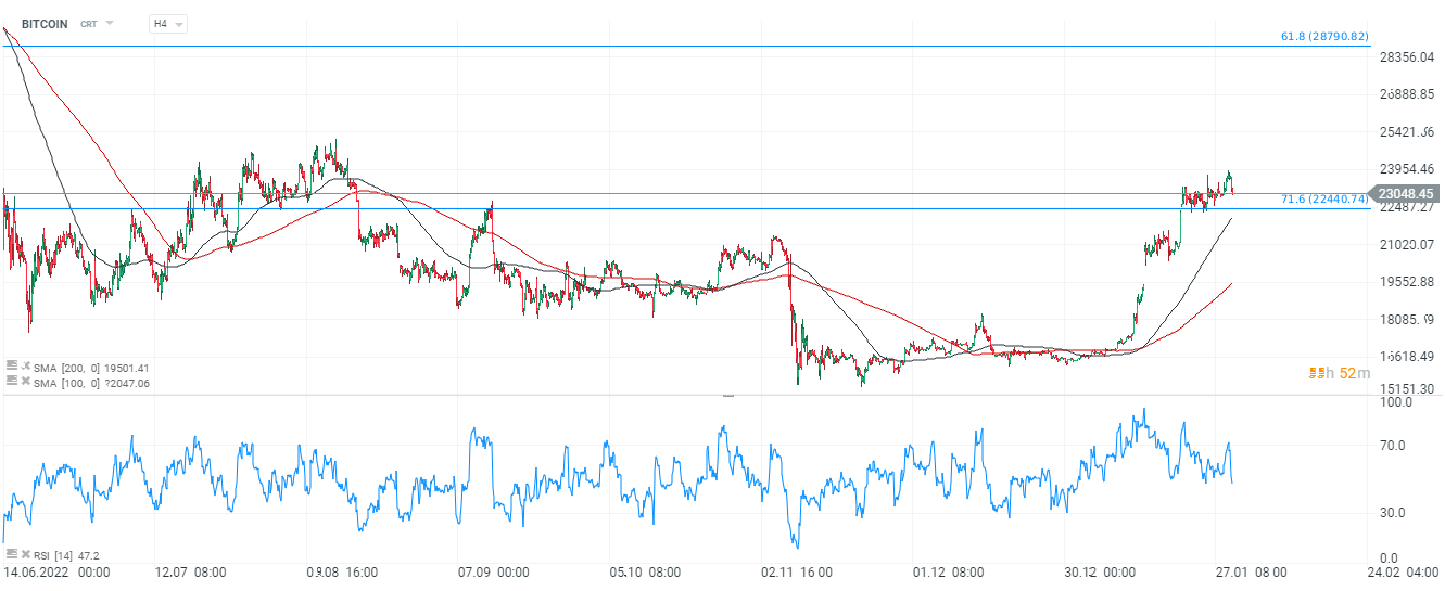 Bitcoin, intervalo H4. Si la aversión al riesgo domina el sentimiento de los inversores esta semana, el nivel clave a observar será la SMA de 100 (negro), el 71.6 del retroceso de Fibonacci de la ola alcista iniciada en la primavera de 2020, el soporte cercano a los $22,000 al cual el precio ha reaccionado positivamente recientemente varias veces. Otro nivel importante en caso de una corrección es el nivel psicológico de $20,000, donde corre la media de 200 horas (rojo). El RSI se ha enfriado y se sitúa en los 47 puntos. Fuente: xStation5