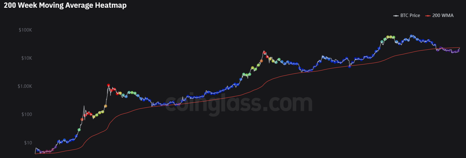 Bitcoin se ha acercado a la media móvil de 200 semanas (WMA200), que ha pasado del soporte histórico en 2022 a la resistencia y se encuentra cerca de los $25,000. Históricamente, el nivel cercano a la WMA200 ha señalado un desvanecimiento inminente; sin embargo, superar la resistencia clave a largo plazo podría ser un desafío para los alcistas, y si el sentimiento positivo en las bolsas no persiste, podría presagiar una debilidad a largo plazo. Fuente: Coinglass