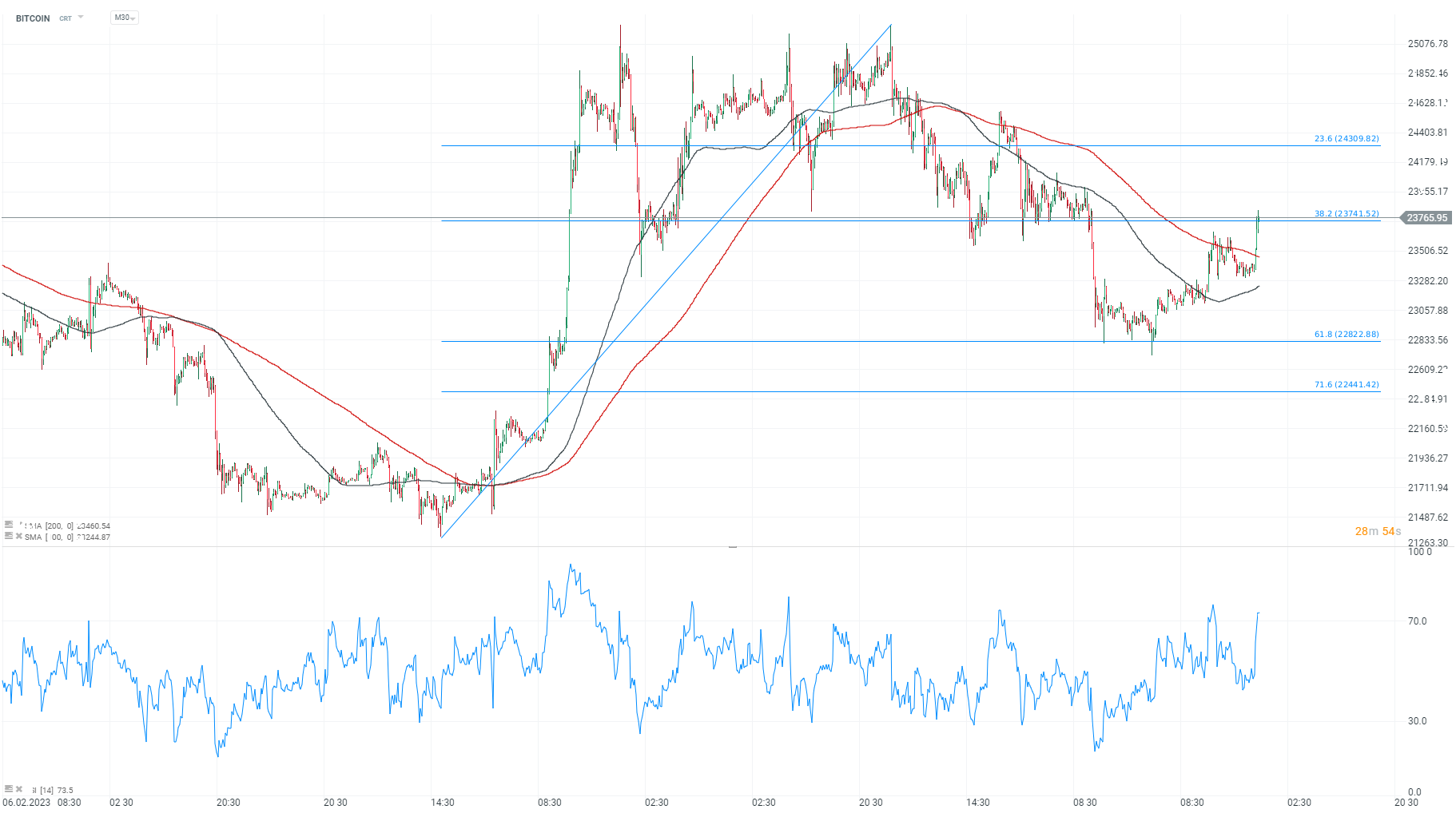 Bitcoin, intervalo M30. La principal criptomoneda ha superado el promedio de SMA200 y está luchando por una ruptura sostenida por encima del retroceso de Fibonacci de 38,2 en 23.800$, lo que podría reabrir el camino a 25.000$. Fuente: xStation5