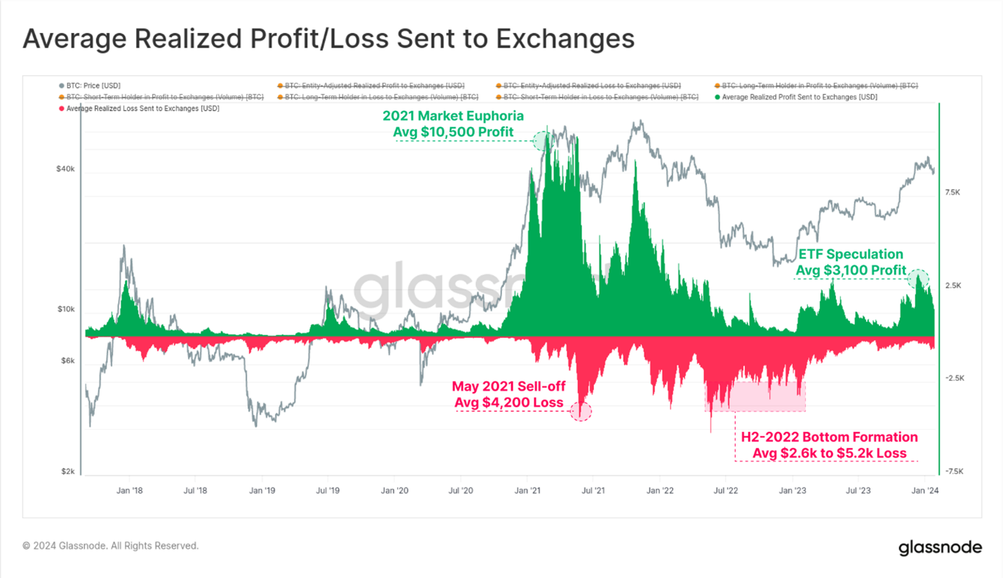 El siguiente cuadro muestra el beneficio promedio de BTC enviado desde billeteras privadas a intercambios de criptomonedas. En plena especulación en torno a la propuesta del ETF, el indicador apuntaba a un beneficio medio de 3,1 mil dólares (el mismo nivel alcanzado durante el pico del 'boom antibancario', en abril de 2023). El resultado aún está lejos del beneficio promedio de 10,5 mil dólares por BTC depositado en las bolsas, en el pico del mercado alcista en 2021.