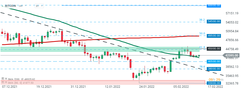 Bitcoin failed to stay above the major resistance zone at $45000, which is marked with 61.8% Fibonacci retracement of the upward wave launched in July 2021 and price pulled back to 50 SMA (green line). Should break lower occur, the next target for sellers is located at $40500 and is marked with previous price reactions. Source: xStation5